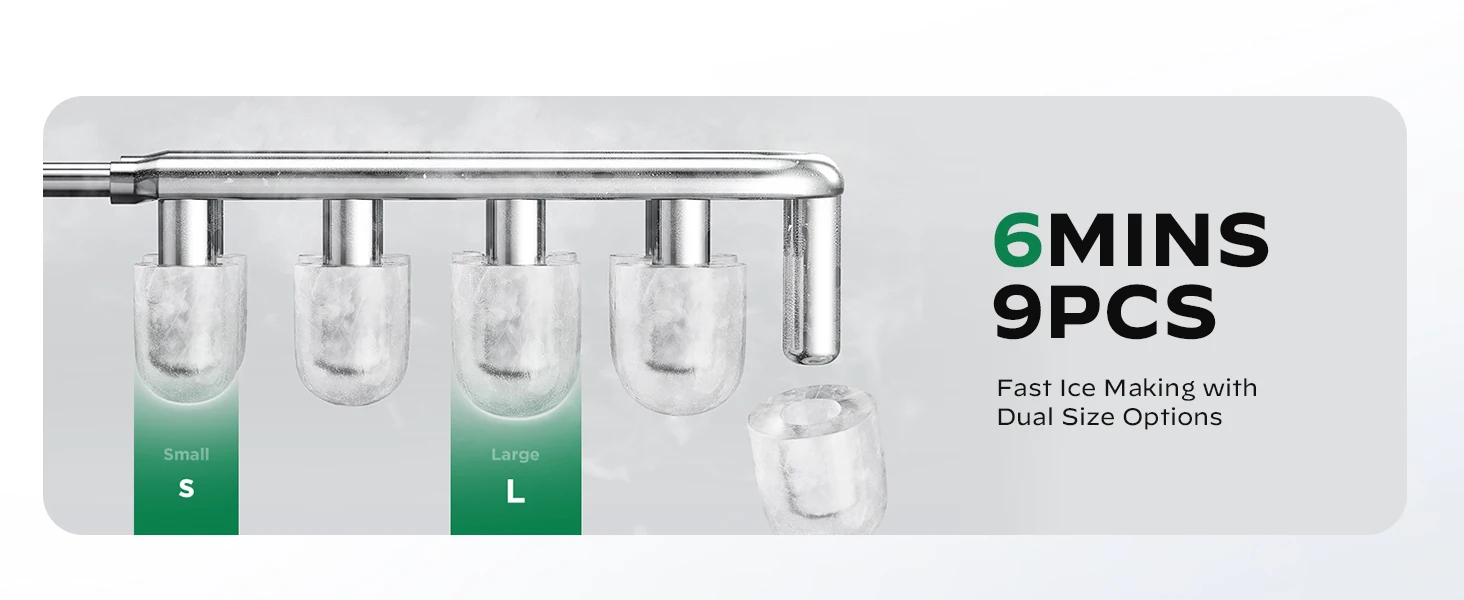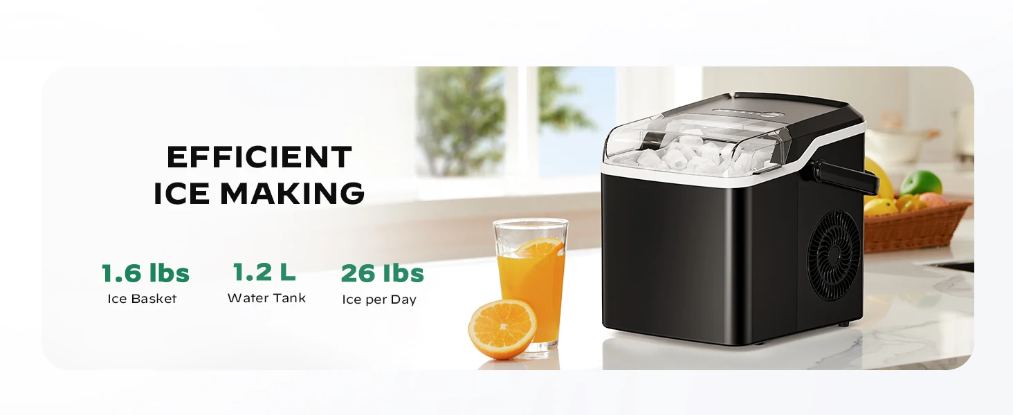 - ➤Fast Ice Making: In just 6 minutes, this ice maker can make 9 perfectly formed bullet ice cubes. The 1.2L water tank can be filled as needed to make a maximum of 26 lbs of ice in 24 hours. Enjoy fresh ice whenever you need it without having to buy bagged ice.
